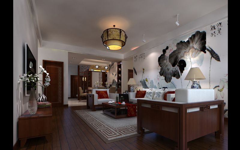 進門處的屏風,有效地劃分了空間的層次感,更加有效地延伸了就餐空間。電視背景墻采用以荷花為主題的墻面噴繪,整個氛圍輕松,而且帶有荷花出淤泥而不染的氣節,更加吻合新中式的口味。